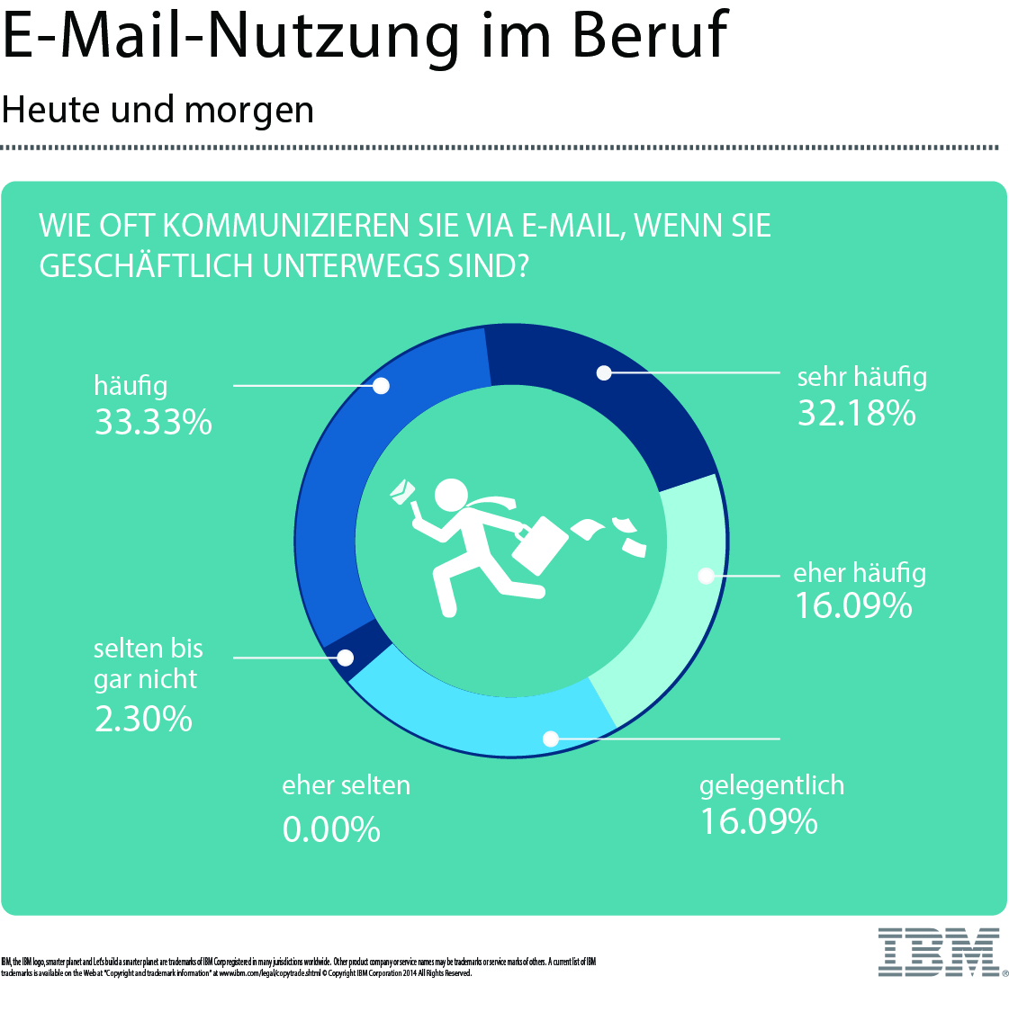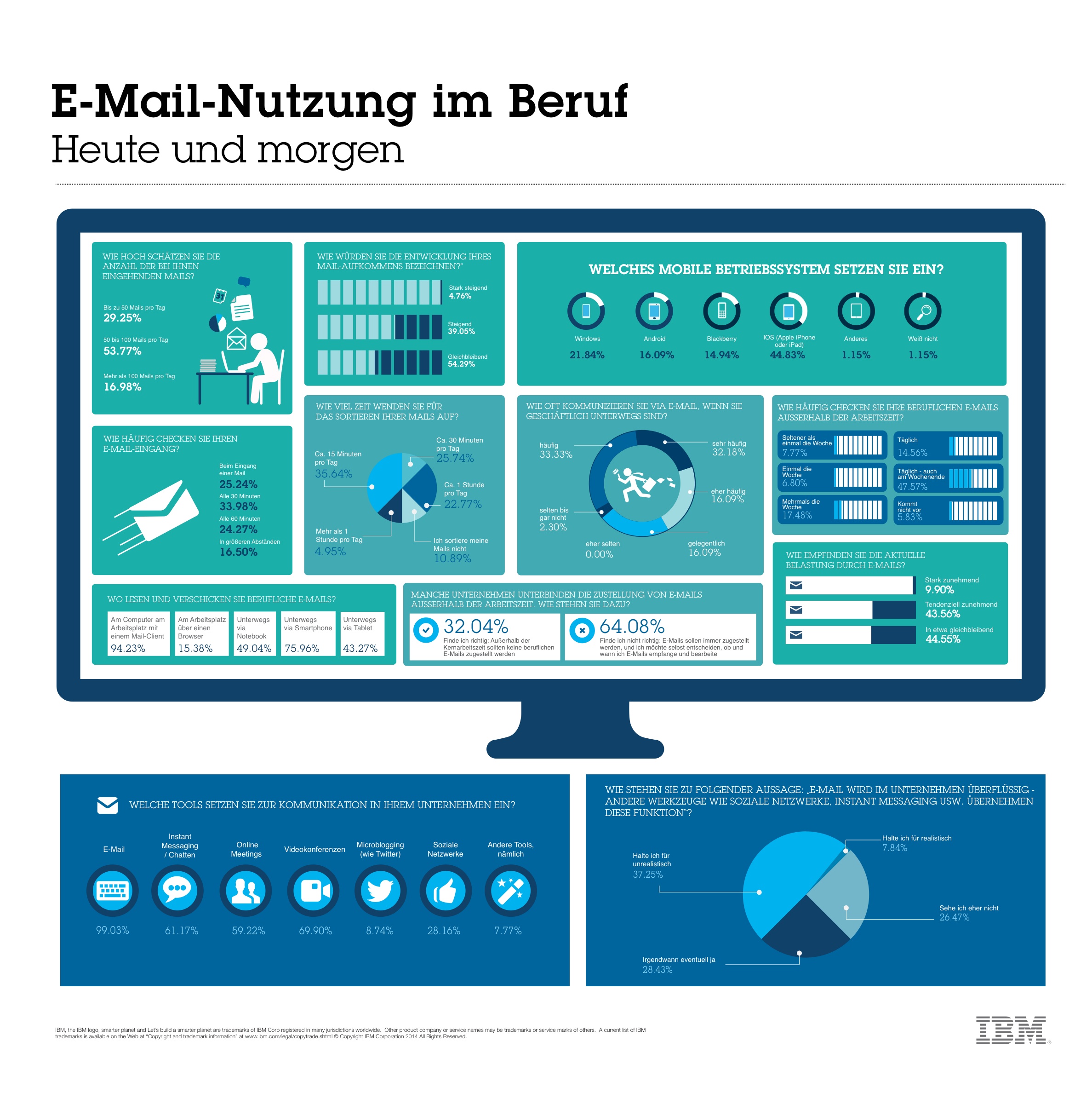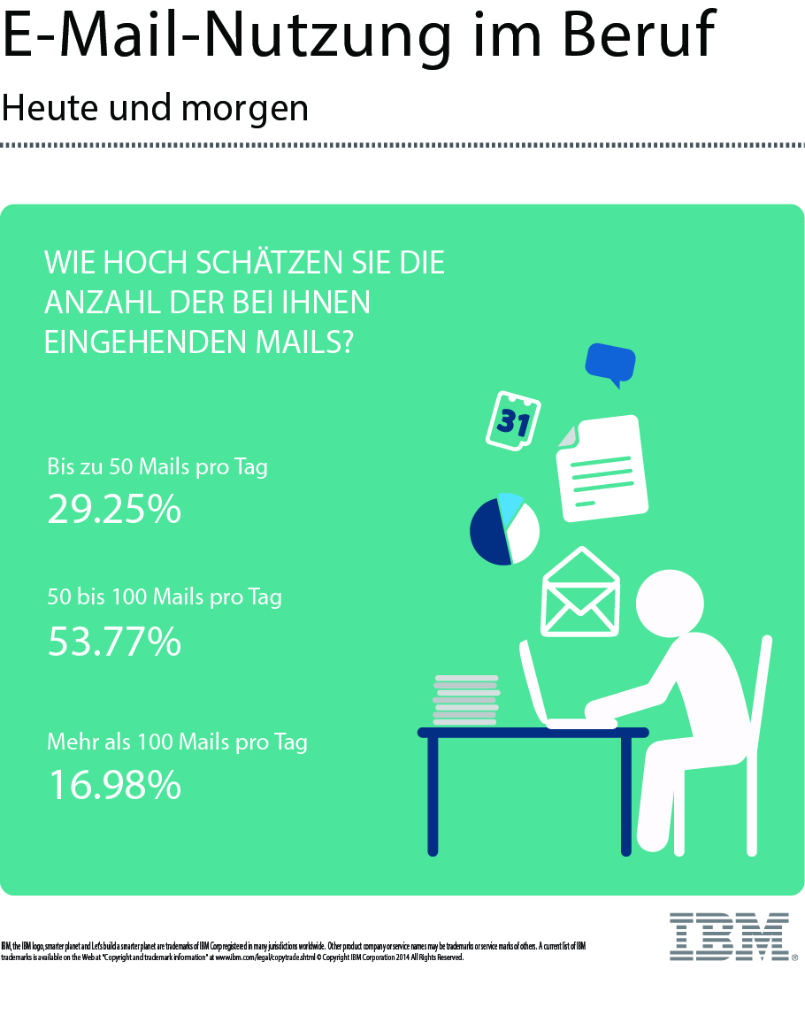 Im Juni 2014 hat IDG Business Research Services im Auftrag von IBM eine Studie zum Thema E-Mail-Nutzung und Zukunft von E-Mail durchgeführt. Die Ergebnisse habe ich hier im Blog und hat IDG auf ibmexperts.computerwoche.de bereits textuell dargestellt und kommentiert. Hier nun einige Infografiken, die ausgewählte Ergebnisse visuell darstellen.