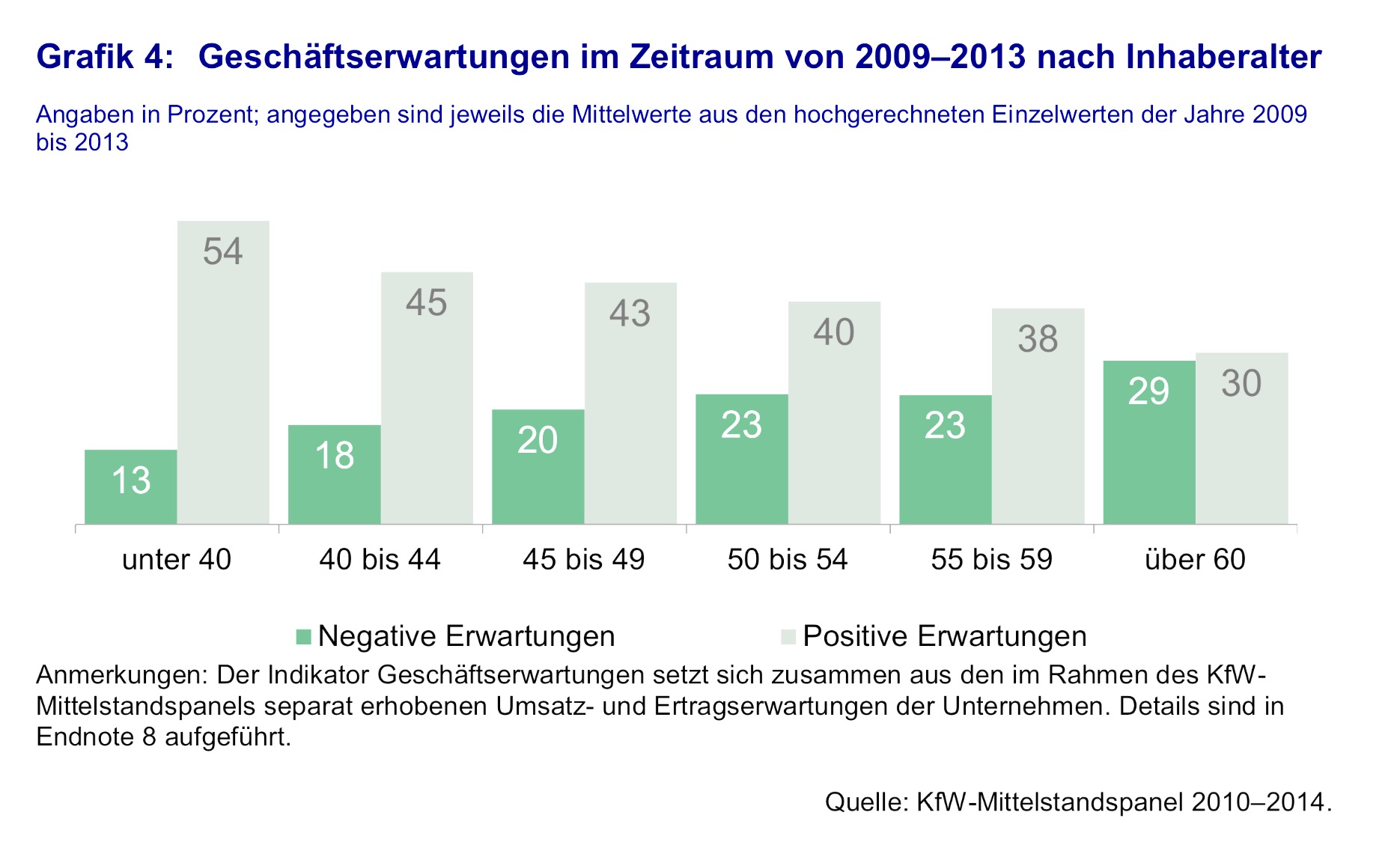 Wie das KfW-Mittelstandspanel der Unternehmensinvestitionen der Jahre 2004-2013 zeigt, ist der Zusammenhang zwischen Inhaberalter und Investitionsbereitschaft unverkennbar: 57 Prozent der Unternehmen mit Chefs unter 40 Jahren investieren. Mit steigendem Unternehmeralter sinkt der Investorenanteil deutlich. Bei den über 60-jährigen Unternehmensinhabern erreicht er nur noch 37 Prozent.