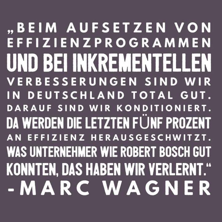 „Beim Aufsetzen von Effizienzprogrammen und bei inkrementellen Verbesserungen sind wir in Deutschland total gut. Darauf sind wir konditioniert. Da werden die letzten fünf Prozent an Effizienz herausgeschwitzt. Was Unternehmer wie Robert Bosch gut konnten, das haben wir verlernt.“