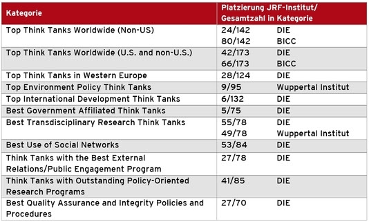 In die Spitzenkategorie im globalen Ranking von Denkfabriken haben es auch in diesem Jahr drei Institute der Johannes-Rau-Forschungsgemeinschaft (JRF) geschafft. Das Deutsche Institut für Entwicklungspolitik (DIE), das Internationale Konversionszentrum Bonn (BICC) und das Wuppertal Institut für Klima, Umwelt, Energie zählen nach dem Global Go To Think Tank-Ranking 2017 zu den renommiertesten Forschungs- und Beratungsinstituten weltweit.