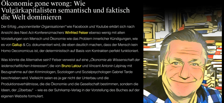 Der Erfolg „exponentieller Organisationen“ wie Facebook und Youtube erklärt sich nach Ansicht des Next Act-Konferenzmachers Winfried Felser ebenso wenig mit alten Vorstellungen von Mensch und Ökonomie wie das Problem innerlicher Kündigungen, wie es von Gallup & Co. dokumentiert wird, die eben deutlich machen, dass der Mensch kein Homo Oeconomicus ist, der deterministisch auf Basis von Kontrakten perfekt funktioniert.