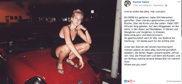 „Unter den Sternen der letzten Sommernacht meines Lebens ist dann alles nochmal gründlich eskaliert, die Seiten flogen, jemand spielte „Africa“ von Toto, die Polizei kam und dann die Russen, und am Schluss machte jemand dieses Bild mit meinem Auto. Where are you now?“