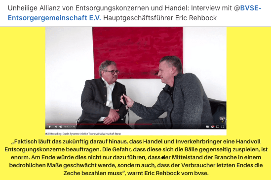„Da bleibt den kleinen und mittelständischen Unternehmen keine Luft mehr, wenn in diesen Regionen Remondis auch noch das Geschäft mit der Verpackungsentsorgung in Händen hält. Der Mittelstand wird so zerrieben“, befürchtet bvse-Hauptgeschäftsführer Eric Rehbock.