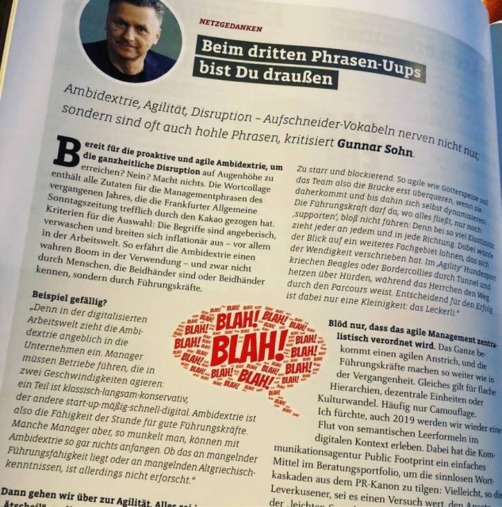 Häufig garniert mit geschwätzigen 4.0-Ergüssen. Es dominieren Begriffs-Designer, die jeden Sachverhalt, bei denen Verdeutlichung wünschenswert wäre, in semantischen Nebelkerzen zum Verschwinden bringen oder Trivialitäten zu babelschen Sprechblasen aufpumpen. Sprachliche Pointen oder stilistische Überraschungen sind in den gut aufgestellten und weltweit führenden Maschinenräumen der PR nicht zu finden. Da regieren Powerpoint-Bulletpoints und Teleprompter-Statements.
