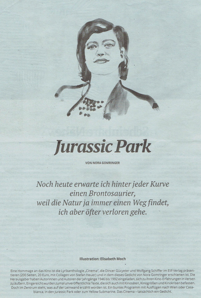 Das Gedicht Jurassic Park von Nora Gomringer zitierend, weist das heutige Büchermagazin des Kölner Stadt-Anzeigers auf die Lyrikanthologie Cinema hin, die ich gemeinsam mit Dincer Gücyeter im ELIF Verlag herausgeben konnte.