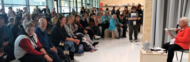 Åse Birkenheier liest im Pavillon des Gastlandes aus einer von ihr übersetzten Sammlung norwegischer Märchen. (Foto: Barbara Lehmann)