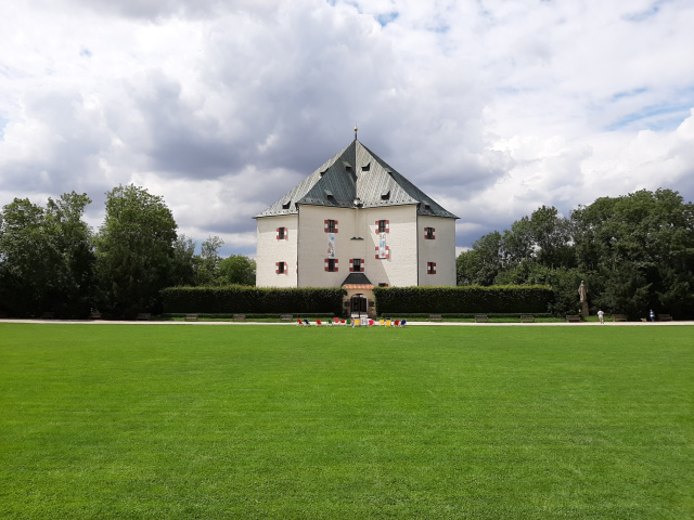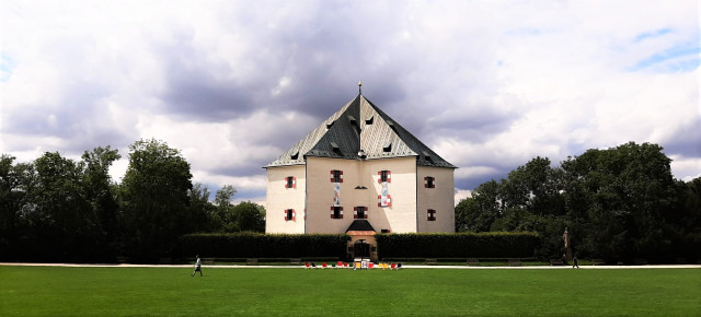 … dass diesmal hier etwas geboten wird, dass über die permanente Ausstellung zur Bauweise und Geschichte des Schlosses hinausgeht, hängen an der Vorderfront des Gebäudes, das in den Jahren 1555 bis 1558 nach einem Planentwurf des Erzherzogs Ferdinand von Österreich (Ferdinand II. von Tirol) in Form eines sechsstrahligen Sterns auf Bílá Hora, dem geschichtsträchtigen Weißen Berg erbaut wurde (im 30jährigen Krieg besiegte hier der katholische böhmische König Ferdinand II. von Habsburg 1620 die Truppen des evangelischen böhmischen Ständestands, der ihn zuvor abgesetzt hatte, und brachte somit die Böhmischen Lande zurück unter die Herrschaft der Habsburger), doch zwei Banner herunter, die auf eine Sonderausstellung zu verweisen scheinen …