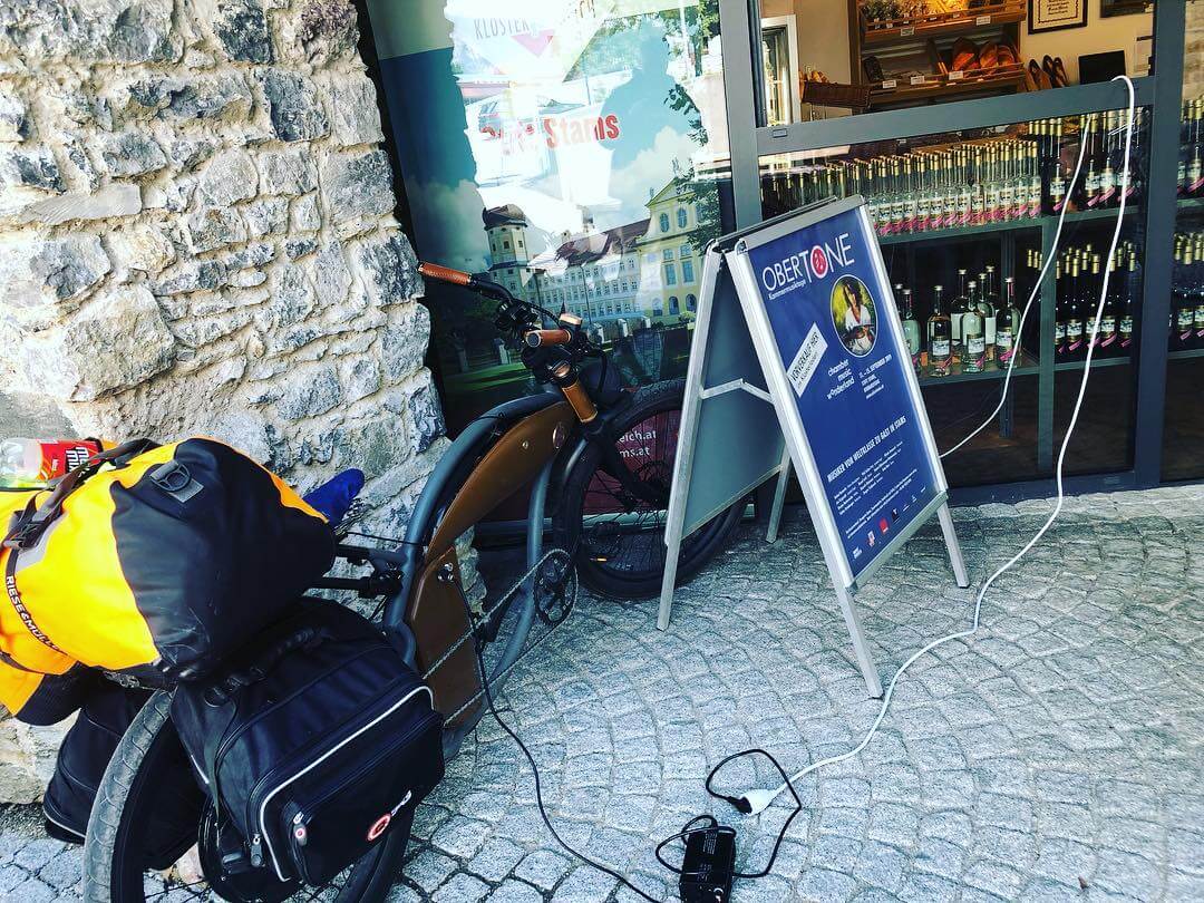 Aus der Ski-Hochburg Stams, wo es zwar eine eigene e-Bike-Ladestation gibt, die aber keiner öffnen kann. Und so wurde für Gunnar eine Ladeverbindung via Klosterladen organisiert:
