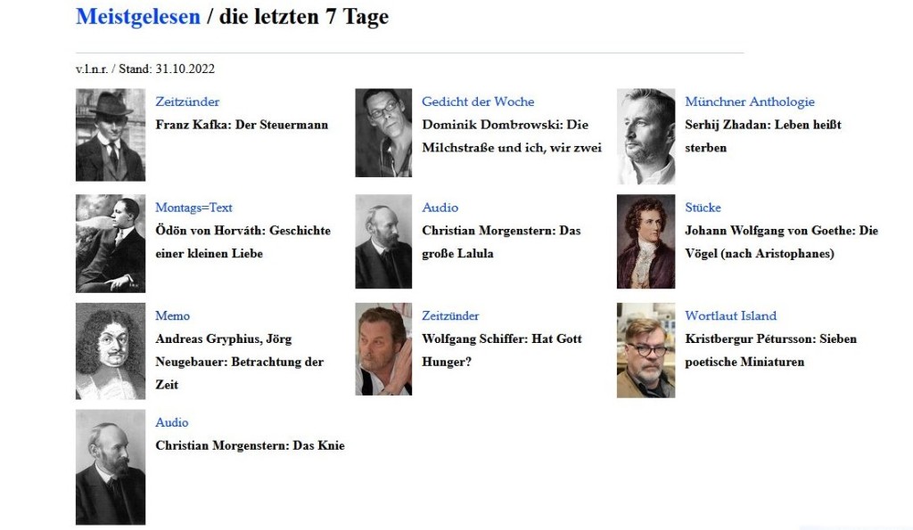 Angesichts der zahlreichen, qualitativ hochwertigen Publikationen, die die Online-Literaturschrift Signaturen-Magazinin ihren verschiedenen Rubriken, vom Originaltext bis zur Rezension, beinah täglich veröffentlicht, sehe zumindest ich es für eine große Ehre an, dort mit gleich zwei Beiträgen, an denen man beteiligt ist, zu den 10 meistgelesenen der letzten 7 Tage zu gehören.